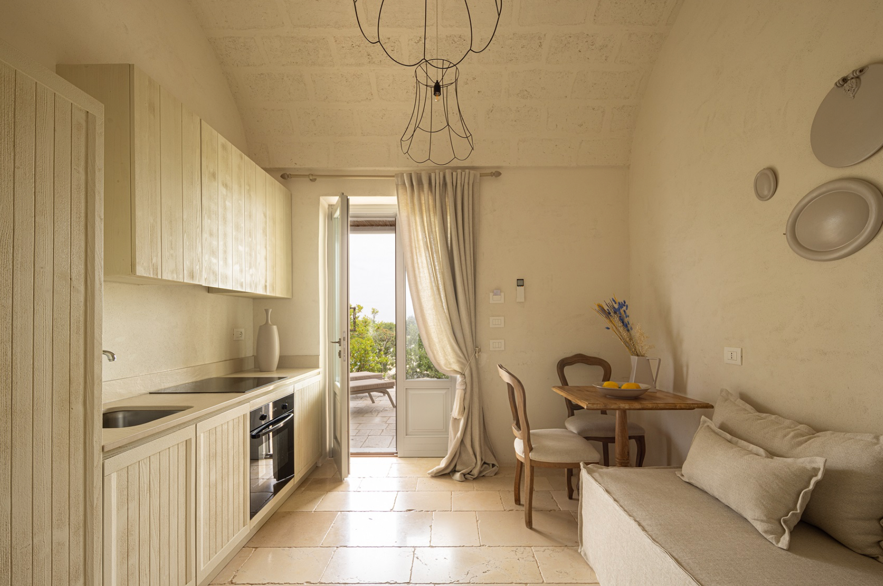 An elegant residence inspired by traditional Apulian style and surrounded by greenery. The Dimora Junior features a comfortable bedroom, private bathroom, well- equipped kitchen, and dining area. A secluded private veranda with lounge seating and an outdoor dining corner offers the perfect space to relax in complete privacy.
